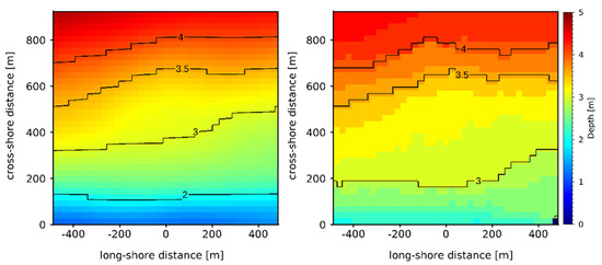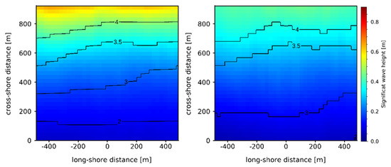 Such discrepancies may be due to the different momentum and radiation stress that characterize long-crested and short-crested waves. Specifically, the larger the wave spreading (i.e., the shorter is the wave crest), the smaller the radiation stress evaluated along the main wave propagation direction in deep waters [39]. This means that long-crested waves ( in our case) are characterized by higher radiation stress, which means that the waves are characterized by significant momentum in the large-scale simulations, which is not taken into account in the small-scale simulations, with the boundary condition being simply assigned in terms of water surface elevation. Such an issue is more evident where the boundary depth is larger, i.e., in the case of Senigallia, where h = 5 m.