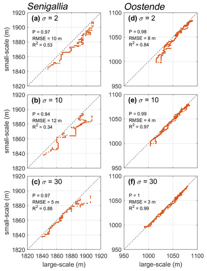 Comparison of cross-shore coordinates of small-scale vs. large-scale inundation for (a–c) Senigallia and (d–f) Oostende, as a function of the wave spreading parameter. Classical error statistics (correlation coefficient p, RMSE, and coefficient of determination R2) are given for each case.