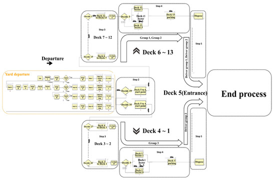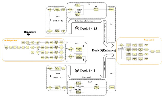 A simulation model for a CAV-loading system was developed based on the simulation model of the AGV-loading system designed in the previous study. Park et al. [14] developed a series of simulation models based on the current loading system to test the impact of AGVs. In Park et al. [14], the simulation model incorporates the loading process within the vessel decks and the parking areas. Park et al. [14] investigated the actual yard size at the terminal, and the departure sequence was then determined. In this study, we combined two previous models to create the full version of the simulation model that shows the entire loading system at the RORO terminal. Figure 2 shows the full version of the current loading system. The departure stage developed by Park et al. [14] is integrated with the left box. Additionally, the returning stage is combined with the correct box. Then, the loading process within the vessel decks and the parking areas developed by Park et al. [13] are integrated in the center of the simulation model. Figure 2 shows the entire loading process from the departure to the end. In contrast, Figure 3 shows the full version of the CAV-loading system. Unlike Figure 2, Figure 3 does not include the corporate returning stage, as the CAV-loading system completes the loading process as parking is completed. Please refer to Park et al. [13] and Park et al. [14] with regards to the details of the simulation module.