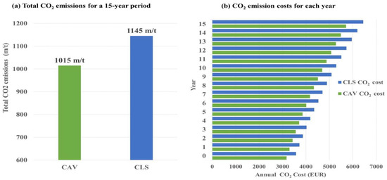 (a) Total CO2 emissions from the current and CAV-loading systems for 15 years; (b) annual CO2 emission costs for current and CAV-loading systems (source: author).