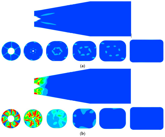 Figure 15 shows the distribution of the W value in the horizontal section of the inlet passage. Since the backflow area is located in the rear part and there is no backflow in the front part of the inlet passage, for convenience of observation the distribution of the W value in the front part is not shown. As shown in Figure 15, there is no backflow in the inlet passage under design conditions. When stall begins, a small area of backflow exists near the outlet section. Under severe stall conditions, the range of backflow in the inlet passage expands significantly due to the worsening of the flow separation in the impeller. Figure 16 shows the distribution of TEPR in the inlet passage. The location of the high-TEPR area coincides with the backflow, which suggests that the notable increase in energy loss under stall conditions is primarily caused by the backflow from the impeller.