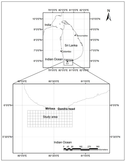 Previous studies have shown that Sri Lanka is an important cetacean habitat, with high species richness and encounter rates, especially of blue whales (BWs) (Balaenoptera musculus indica) [1,2,3,4]. Moreover, Sri Lanka is located at the centre of the Indian Ocean Marine Mammal Sanctuary (IOMMS) between the latitudes 5°55′ and 9°51′ N and longitudes 79°41′ and 81°53′ E, south of the Indian subcontinent, separated by the narrow Palk Strait. Oceanic processes around the island are driven by two major monsoonal winds in combination with bathymetric features (i.e., submarine canyons), all of which produce intense upwelling [5], which, in turn, provide ideal foraging conditions for aggregations of BWs [6]. An increasing number of previous studies, e.g., [7,8,9,10], have shown that BWs are a group of stenophagous predators and exclusively prefer to make feeding aggregation on productive upwelling regions, where patchy and dense krill aggregations occur. Gill et al. [11] revealed that the sea surface temperature and other various seascape variables associated with upwelling played a significant role in the Bonney upwelling region used by blue whales for feeding. Moreover, frequent aggregations of BWs along the edge of the Monterey Bay submarine canyon were also documented [7].