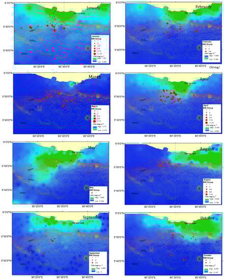 The monthly CHL-a and SST concentrations in the year 2015 were highly variable. According to Table 3, the highest CHL-a concentrations were recorded during the month of May 1.107 ± 0.19 (range 0.193–7.992) mg/m3 and August 0.527 ± 0.1140 (range 0.156–4.946) mg/m3 in the SW monsoon, and the lowest was 0.126 ± 0.01 (range 0.083–2.032) mg/m3 in April and March 0.140 ± 0.004 (0.119–1.77) mg/m3 in the first intermonsoon (IM1). Even though small chlorophyll concentrations were recorded during the March and April BW sightings, they were comparatively high (Figure 2). According to Figure 2, the high CHL-a concentrations observed close to the coastal line might be the coastal upwelling induced by the river inflow (Polwathumodara and Nilwala) to Weligama Bay and Matara. In contrast, this high sea surface CHL-a distribution was limited to the area from the 1000 m isobath to the coastline.