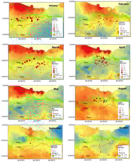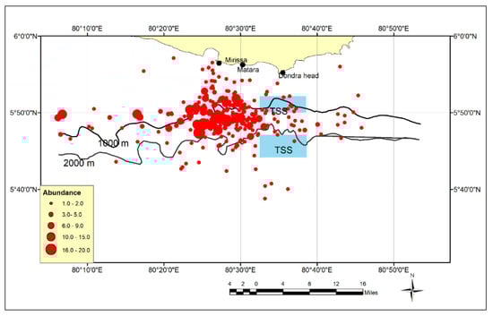 The annual relative abundance and distribution of the BWs around the traffic separation scheme (TSS) below the south end of Sri Lanka are shown in Figure 4.