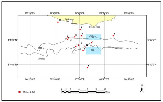 Sighting of pregnant cow (1) and mother–calf pairs (2–13) off Mirissa, south coast of Sri Lanka. TSS is the traffic separation scheme.