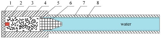 Schematic diagram of underwater ventilated launch. 1—breech, 2—igniter, 3—chamber, 4—propellant, 5—belt, 6—projectile, 7—barrel, 8—groove.