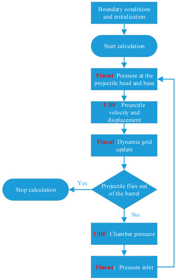 A fourth-order Runge–Kutta method is used to solve the interior ballistic model of the ventilated launch [21,22]. The gas–liquid flow field solution is based on the CFD software FLUENT. A user-defined function (UDF) is used to compile the interior ballistic program into FLUENT software. Figure 2 depicts the FLUENT and UDF coupling solution procedure.
