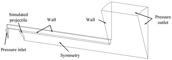 The calculation domain is shown in Figure 3. The inlet pressure is calculated in the simulation by determining the pressure in the chamber. The outlet pressure is p0 and the temperature is T0. For all numerical calculation examples in this paper, p0 is set to 101,325 Pa and T0 is set to 300 K. The motion of the projectile along the axis of the barrel is taken into account and treated as a moving rigid body.