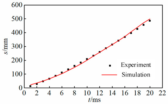 Based on the aforementioned concept and methodology, a numerical validation is performed. Projectile E’s experimental finding from reference [23] is repeated. The numerical and experimental findings of the axial displacement of the gas-curtain are shown in Figure 4. The figure illustrates that the model built above is practicable because the average error between simulation and experiment is no more than 4.86%.
