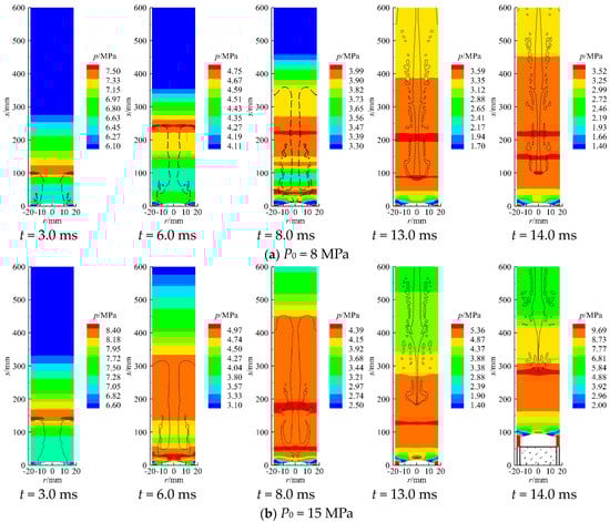 The underwater ventilated launch procedure is compared using the same propellant at the four different gas injection pressures: 8, 10, 15, and 20 MPa. Figure 5 shows the evolution process of the pressure within a symmetrical cross-section when the gas injection pressure (P0) is 8, 15, and 20 MPa. The jet contour curve is depicted by the black dashed line.