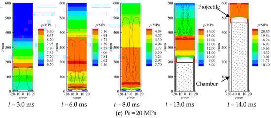 At 13.0 ms, the pressure within the barrel is still falling compared to the prior time when P0 = 8 MPa, but it is rising compared to the preceding moment when P0 = 15 MPa and P0 = 20 MPa. This is due to the fact that the projectile has already begun to travel in both working scenarios, which enhances the interaction between the projectile and the gas-curtain. At 14.0 ms, the local high-pressure zone right above the projectile head is still there under the operating condition P0 = 15 MPa, but the pressure above the projectile head has tended to be dispersed evenly when P0 = 20 MPa. It is clear that the initial injection pressure influences the gas-curtain expansion process as well as the projectile motion, which in turn influences the characteristics of pressure distribution inside the barrel.