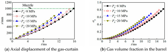 According to numerical simulation, the projectile starts to move at 15.8, 14.7, 12.5, and 10.8 ms under the four different operating conditions, respectively. The variation curve for the axial expansion displacement of the gas-curtain under the four different gas injection pressures is shown in Figure 7, together with the gas volume fraction in the barrel during the drainage stage. The gas volume fraction in the barrel gradually increases along with the axial expansion displacement of the gas-curtain as the gas injection pressure rises. Additionally, the growth rate for both the axial expansion speed of the gas-curtain and the gas volume fraction in the barrel gradually rises.