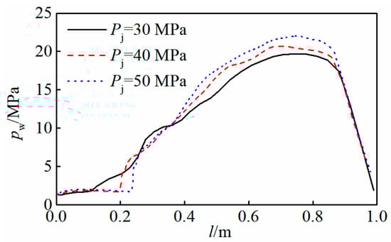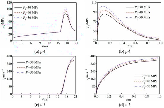 In this section, the interior ballistic properties of the ventilated launch at projectile starting pressures (Pj) of 30, 40, and 50 MPa are compared and analyzed. P0 = 8 MPa is the chosen gas injection pressure.