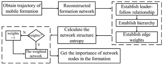 By analyzing the interaction between the nodes and their indirect nodes, the entropy of the network structure is used to measure the importance of several nodes in the network. Considering that in the formation network structure, the instruction is transmitted from a high level to a low-level UUV, the node importance of the directed network is only analyzed; therefore, it is considered that the entry value of the node is smaller than the influence of the degree value on the node, and the impact factor is . In more detail, the milestone algorithm steps are presented as follows: