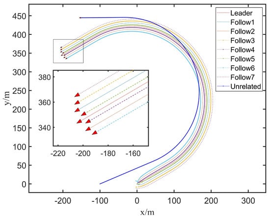 In addition, we added the trajectory of an unrelated UUV to the formation in the simulation to compare and judge the effects of this additional feature. Therefore, the simulation results are displayed in Figure 3.