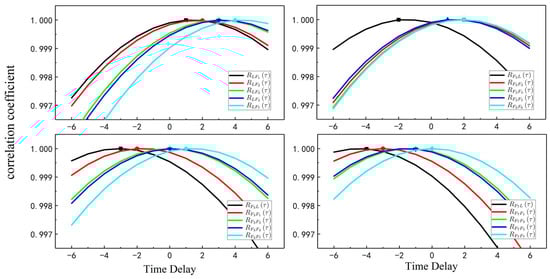 In addition, we set a threshold : when the motion correlation coefficient at a certain point in time is bigger than the threshold (e.g., ), it is believed that there is a leader–follower relation between the two UUVs at this moment. Therefore, in order to better determine the appropriate delay time, in the actual calculation process, individual motion correlation coefficients, having smaller values than the threshold, and mainly caused by the instability of the data or the error of acquiring the data, are used. Thus, the average motion correlation coefficient is determined as follows: