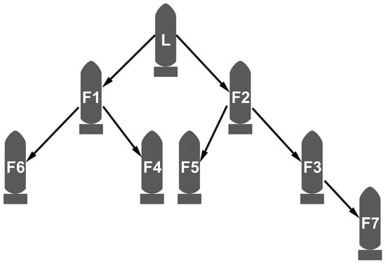 Limited by the narrow bandwidth of the underwater acoustic channel and the UUV formation method, the UUV formation movement mostly adopts a hierarchical interaction structure []. Moreover, it is faster and more efficient in navigation and command execution than in the equal interaction structure. While using hierarchical interaction in the underwater unmanned cluster formation, there is a hierarchical structure relationship between UUVs, and the higher the level of UUVs, the better its control and the greater the importance in the formation network will be.