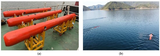 In order to verify the effectiveness of critical node identification of the multi-UUV formation algorithm proposed in this paper, the lake formation experiment was carried out, and the real dead reckoning data were obtained to place the detection of UUV formations. Therefore, three vehicles set up the trajectory of vehicles, not linked to the formation navigation, while sailing in linear and triangular formations on the Qiandao Lake in Hangzhou City as the test location in order to confirm that the algorithm can successfully recognize different network structures. Figure 6a shows the experiment platform and Figure 6b shows UUV formation sailing on the water. Two sets of trajectory points recorded by the UUV itself are shown in Figure 7: