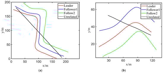 Referring to the paths of Figure 7, the follower has several degrees of error with respect to the leader’s trajectory, but the trajectory it follows has generally the same shape. The space–time UUV trajectories were substituted every two pairs with the motion similarity model to obtain the following motion correlation coefficient (refer to Equation (25)) and time delay tables (refer to Table 6 and Table 7):