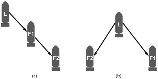 Multi-UUV formation. (a) Linear shape formation structure, (b) Triangular shape formation structure. The letters L and F stand for leader UUV and follower UUV; F1 denotes Follow1 UUV and F2 denotes Follow2 UUV. The arrows indicate the direction of information transmission in the formation network.