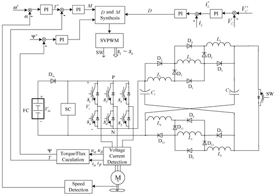 In Figure 1, SVPWM is the space vector pulse-width modulation. From Figure 1, it can be seen that the system control includes two parts: the DC-side capacitor voltage closed-loop control and the AC-side speed control. The DC-side capacitor voltage control generates a shoot-through signal D, and the AC-side speed control generates a modulation ratio M according to the operating state of the hybrid power ship. Thus, the output power of the FC and SC is controlled.