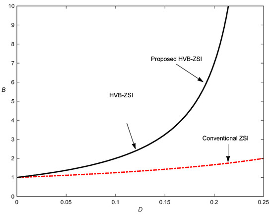 The boost factors of the conventional ZSI and HVB-ZSI are given in [7,24]. The B comparison of the three inverters is shown in Figure 4. From Figure 4, it can be seen that under the same D, the proposed HVB-ZSI has the same boost capacity as HVB-ZSI, but it is much higher than the conventional ZSI.