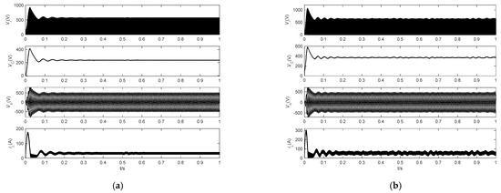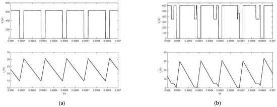 Figure 7 shows the Vi and iL waveforms of the two inverters at light load (R = 300 Ω/phase). From Figure 7, it can be seen that the proposed HVB-ZSI can eliminate the DC-link voltage distortion in the light-load state. The simulation results confirm the correctness of the above analysis.