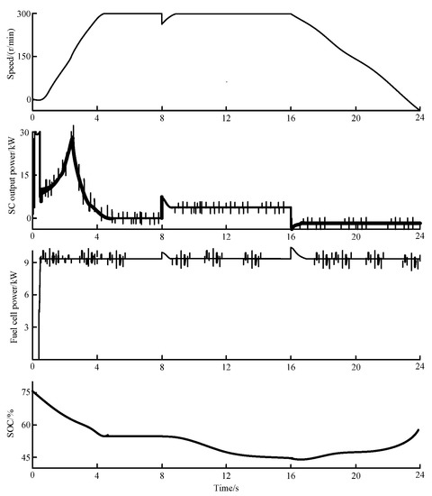 In Figure 9, the curves from top to bottom are the propulsion motor speed n, output power of the SC, output power of FC, and SOC. ① Stage 1 (0–5 s): in this stage, the ship starts and accelerates from 0 to 300 r/min with the rated load, and the ship sails in mode 2; ② Stage 2 (5–8 s): The ship sails at a constant speed with rated load, and during this phase, the ship operates in mode 1; ③ Stage 3 (8–16 s): at 8 s, the ship sails at 1.2 TN; ④ Stage 4 (16–24 s): In this phase, the ship brakes and works in the regenerative braking state, and the regenerative braking energy is stored into the SC. As seen in Figure 9, the average power is delivered by the FC and the dynamic power is supplied by the SC in stage 1; the SOC of SC gradually decreases, and the hybrid power ship runs in mode 2. In stage 2, the ship sails at a constant speed in mode 1; the rated power is delivered by the FC, the SC does not deliver the power, and the SOC does not change. In stage 3, the ship is overloaded, the FC delivers the rated power, and the SC delivers the overload power; the hybrid power ship runs in mode 2. In stage 4, the ship brakes to a stop, the SC absorbs the regenerative braking energy, and the hybrid power ship operates in mode 3; the SOC gradually increases.