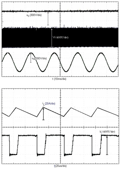 The experimental curves of the proposed HVB-ZSI in case 1 are shown in Figure 12. As shown in Figure 12, VC is boosted to 252 V, Vi is boosted to 598 V, and the peak value of phase voltage ua is 311 V. The experimental results are almost the same as those of the simulation results.
