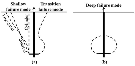 There are three failure modes for single-helix anchors as the embedment depth ratio (H/D) increases, where D is the helix diameter. Figure 1 shows the shallow failure mode [,,,,,,,,,], deep failure mode [,,,,], and transition failure mode [,] of circular plate anchors or single-helix anchors, which have been observed in most investigations. The rupture surface extends continuously to the ground at a shallow plate depth, defined as general shear failure or the shallow failure mode. With the increase in plate depth, the transition failure mode is observed, often referred to as the shallow failure mode [,]. The shallow rupture surface has been assumed to be a cylinder [], an inverted cone [,,], or a log-spiral surface [,,]. Only a few small-scale model tests showed a closed bulb (or balloon-shaped) rupture surface [,,,,]. The rupture surface is limited under the ground at a deep depth, defined as local shear failure or the deep failure mode. Recently, a centrifuge test with H/D = 7 observed the deep rupture surface in medium dense sand []. Although it provided intuitive observation, there could be a discrepancy between the results of the half-anchor model and the full-anchor model due to the difference in sand–strongbox interaction from the internal friction of sand.