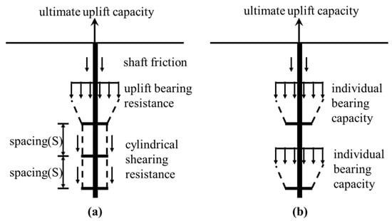 - The estimation of uplift capacity for multi-helix anchors with transition helix spacing based on the two recognized failure modes (Figure 2) is inconsistent. That is, when the helix spacing is transition spacing, the uplift capacity calculated by the individual bearing method is higher than that calculated by the cylindrical shear method.