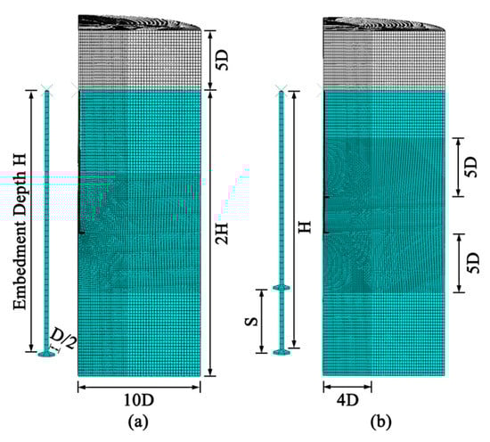 The FEM models were constructed as illustrated in Figure 3. Helical plates were replaced with circular plates based on previous findings that the plates’ geometrical shape has little influence on the uplift capacity [,], and this analysis does not focus on the stress of the anchor body. Only one-quarter of the anchor and soil domain was considered in this study in terms of axisymmetry. Boundary conditions were imposed on the two planes of symmetry by prescribing zero flow velocity as normal to these planes. The bottom of the computational domain was constrained against the flow in the vertical direction. The single-helix anchors had an embedment ratio of 8~12. The lowermost plate of the multi-helix anchors had the same embedment ratio of 12, varied spacing ratios of 1.5~6.0, and varied plate numbers of 2~4.
