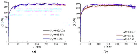 The load–displacement curves of different pullout rates are illustrated in Figure 5a, with the minimum element size ΔB = 0.1D. The pullout rate V has little influence on the uplift process. When the displacement is up to 0.5D, the computational time of V1 and V2 is about 12 times and 2 times that of V3, respectively. Hence, considering the time consumption and stability, the pullout rate V2 was adopted for all subsequent analyses.