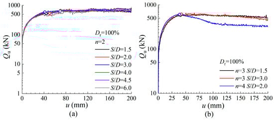 The relationship between load and displacement of single-helix anchors (H/D = 8~12) in sand with different densities is presented in Figure 6. The relationship between load and displacement of multi-helix anchors in dense sand is shown in Figure 7. The characteristics of these curves can be divided into two types: those with an obvious peak point, and those without an obvious peak point. The peak values of the curves were undoubtedly taken as the ultimate uplift capacities, and the uplift capacities for the curves without obvious peak points were determined according to the curve development. The development of these curves presents three stages: the fast-rising straight-line stage, the curved stage, and a prolonged rising or stable stage (approximately a straight line). The starting point of the latter stationary section was regarded as the ultimate uplift capacity, Qu, and the corresponding displacement is called failure displacement, uf. The points of Qu are represented by circles in Figure 6 and Figure 7.