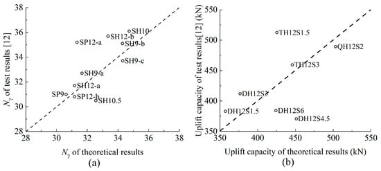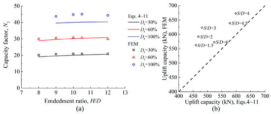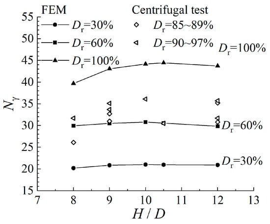 The uplift capacity factors Nγ for single-helix anchors from the FEM and centrifugal tests are plotted in Figure 8a, which shows that the uplift capacity factors of single-helix anchors are roughly constant as the embedment ratio H/D increases in loose sand, medium dense sand, and dense sand with H/D > 9. This feature is related to the failure mode, which will be explained later. The uplift capacity factors from the centrifugal test with Dr = 85.4~96.2% are encompassed between the numerical results of medium and dense sand. This result verifies the reliability of the FEM model. However, the FEM results overestimated the uplift capacities of helical anchors. This difference may be caused by the dilatancy angle determined by Bolton’s equation [], which is larger than the actual situation.