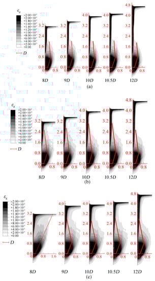 Single-helix anchor cases: contour of equivalent plastic strain and rupture surface (red line). (a) Loose sand. (b) Medium dense sand. (c) Dense sand.