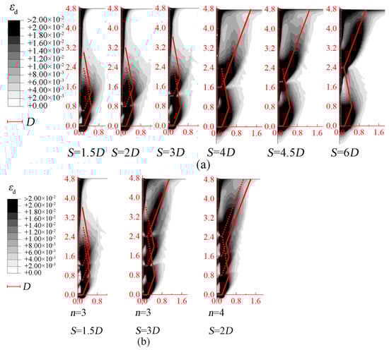 Compared with the failure mode of the single-helix anchor shown in Figure 11, it is worth noting that the helix spacing has little influence on the equivalent plastic strain range induced by each helical plate. For example, the soil mobilized zone of the double-helix anchor with S/D = 2 is just like a superposition of two single-helix anchors with H/D = 12 and H/D = 9. The upper plate experiences a transitional failure mode when the S/D = 4 for a double-helix anchor. When the S/D = 6 for the double-helix anchor, it is evident that the boundary of the soil mobilized zone caused by the lower plate bends towards the shaft. For multi-helix anchors, if more than one plate is at a shallow depth, the soil mobilized zone caused by the lowermost shallow plate will cover the mobilized zone of the other shallow plates, as with the quadruple-helix anchor shown in Figure 11b. The numerical observation confirms the conclusion from the centrifugal test that additional helices do not provide additional capacity if they are located within the region of soil mobilized by a lower helix []. As a result, the uplift resistance of the multi-helix anchor should be provided by the lowest shallow plate and each deep plate. The range of the soil plastic zone caused by each plate is only tied to the plate’s embedment depth. The rupture surface of the multi-helix anchor can be regarded as the superposition of each helical plate’s rupture surface when the above rule is adopted to identify the rupture surfaces [,], as shown by the solid red line in Figure 11.