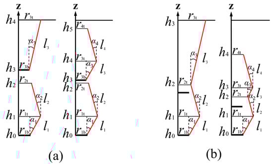 where li is the vertical height of the ith rupture surface, and its bottom and top radii are rib and rit, respectively. These parameters can be determined by geometry.