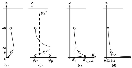 where zp is the vertical distance of the peak value point from the plate, and κ is the exponential decrease rate. The position of zp is always within 0.33D and has little relation to the relative density and embedment depth. Thus, zp can be taken as 0.33D in Equation (9). The value of Ku,peak in loose, medium, and dense sand is 3.5, 5, and 6.5, respectively. The value of κ is fitted to be 1.8.