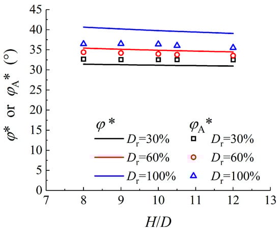 The values of the modulus, peak friction angle, and dilatancy angle depend on confining pressure at the lowermost plate. For dense sand (Dr = 100%) used in the centrifugal test [], Young’s modulus E and the peak internal friction angle φp are taken from the literature [] after being obtained from triaxial tests; that is, E = 658 pa (σ3/pa)0.469 and φp = 40.9–7.8l g (σ3/pa), where pa is the standard atmospheric pressure (101.3 kPa) and σ3 is the confining pressure and takes the value of gravity stress γ’H, kPa. The values of φp herein are relatively close to those for dense uwa sand in the recent literature [,], and their difference is 1~2°. The values of E and φp for loose sand (Dr = 30%) and medium dense sand (Dr = 60%) were calculated proportionally based on the literature []. The densities of different compactness were 1.61 g/cm3, 1.66 g/cm3, and 1.75 g/cm3, respectively. There was no groundwater influence, so the soil’s effective unit weight γ’ was 15.8 kN/m3, 16.3 kN/m3, and 17.2 kN/m3, respectively. The peak dilatancy angle ψp was estimated by the equation φp = 0.5ψp + φcr proposed by Bolton []. The validity of the loose sand and medium dense sand parameters was determined by comparison with the triaxial test results in reference []. The soil parameters for different embedment ratios are summarized in Table 1. Other parameters were determined based on reference []—that is, φcr = 31°, v = 0.3, K0 = 1 − sinφcr = 0.485, = 2%, and = 20%.