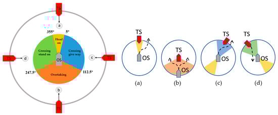 - Crossing give-way situation: When one vessel (TS) is located within (5°, 112.5°) of the other vessel’s (OS)’s azimuth, this situation is considered as the crossing give-way. The OS vessel should alter her course to starboard to avoid the TS vessel. The crossing give-way situation is shown in Figure 4c.