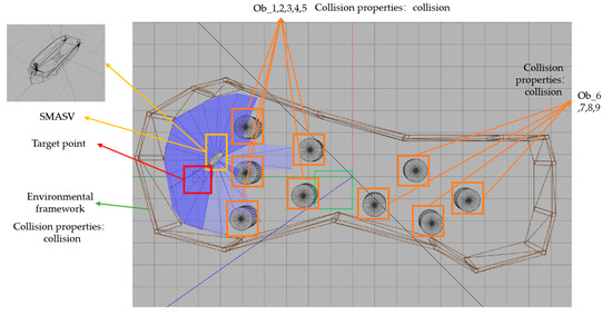 A high reward value is obtained when the SMASV reaches the target location. This causes the SMASV to regard the target point as the learning target. A large negative reward is obtained when the SMASV collides with an obstacle. This allows the SMASV to learn to avoid obstacles. The reward function is set as follows: