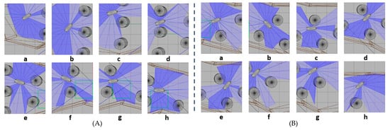 (A) SMASV avoiding obstacles in the Env-Train after 700 training iterations. Subfigures (a–d) SMASV avoiding ob1, ob2, and ob3, respectively; (e–h) SMASV avoiding ob4 and ob5, respectively; (B) SMASV avoiding obstacles in the Env-Train after 1000 training iterations; (a–e) SMASV avoiding ob6 and ob7, respectively; (f–h) SMASV avoiding ob8 and ob9, respectively.