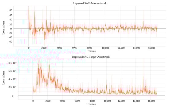 The target-Q1 network had a large decrease in loss value at the beginning of the training, indicating that the learning rate was appropriate and the gradient descent process was performed. After 5000 iterations of learning, the loss values converged to a stable state, and the change in loss function was not as evident as it was in the beginning states. Simultaneously, the actor network began to converge at approximately 3500 iterations during training and the convergence rate was relatively stable. The network-loss-function value of the improved SAC algorithm was compared to that of the traditional DRL algorithm, as shown in Figure 11. The results showed that the improved SAC algorithm is more stable and converges rapidly for neural-network training.