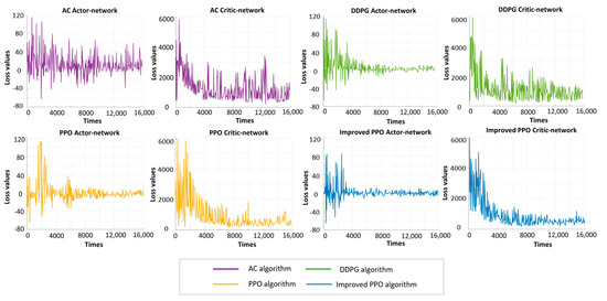 The target-Q1 network had a large decrease in loss value at the beginning of the training, indicating that the learning rate was appropriate and the gradient descent process was performed. After 5000 iterations of learning, the loss values converged to a stable state, and the change in loss function was not as evident as it was in the beginning states. Simultaneously, the actor network began to converge at approximately 3500 iterations during training and the convergence rate was relatively stable. The network-loss-function value of the improved SAC algorithm was compared to that of the traditional DRL algorithm, as shown in Figure 11. The results showed that the improved SAC algorithm is more stable and converges rapidly for neural-network training.