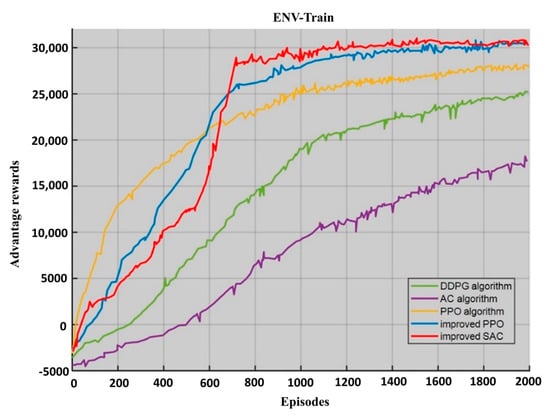After 800 episodes, the improved SAC algorithm began to converge, and the fluctuation of the reward-function value was very minimal. Under the above conditions, the convergence rate of the improved SAC algorithm outperformed that of the improved PPO algorithm and the PPO algorithm by approximately 12% and 45%, respectively.