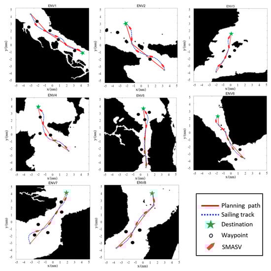 In addition, to verify the generalization ability of the proposed intelligent-SMASV navigation system, we built several simulation environments in different water areas. In this regard, we extracted eight representative water areas from the constructed simulation environments, as shown in Figure 13.