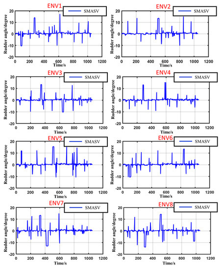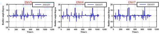 In Environment 7, the SMASV and TS02 are in an overtaking situation. The SMASV chose to alter her course to starboard 15° continuously to avoid TS02. Then, the SMASV and TS03 constituted a crossing give-way situation. The SMASV chose to alter her course to starboard 15°. Finally, the SMASV and TS01 constituted a head-on situation. When SMASV was 0.4 nautical miles away from TS01, the SMASV altered her course to starboard 15°, then altered her course to port 7° to avoid TS01. Figure 17 shows the changes in the rudder angle during the ship navigation.