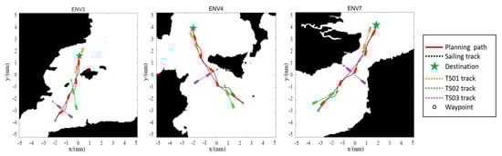 To verify that the trained intelligent SMASV navigation system complies with the COLREGs, we carried out an additional experiment. The three wide waters of Environments 3, 4, and 7 were used as the COLREGs verification environments. As shown in Figure 16, the red line represents the planning path, the black line represents the decision-making track, and there are three target ships in each environment. TS01 was used to simulate the head-on case, TS02 was used to simulate the overtaking case, and TS03 was used to simulate the crossing give-way and crossing stand-on cases. The encounter angle, the minimum encounter distance, and the collision-avoidance action of the SMASV and other TSs in the encounter process are illustrated in Table 4.