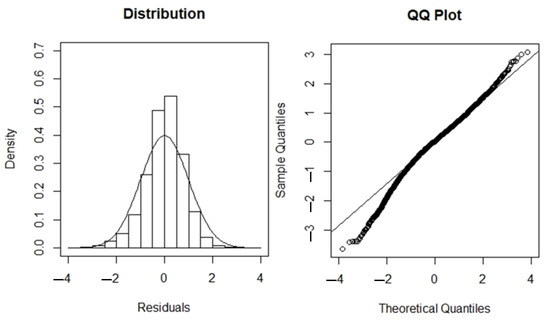 The final GLM model, which included all factors, had a deviance explained value of 0.58 (Table S1). Because the standardisation model’s histogram and quantile–quantile plot (Figure 1) revealed a nearly normal distribution, the model was used to standardise the mature albacore tuna N.CPUE. The monthly summed catch per unit effort (CPUE) ranged from 0.1 to 2700 individuals (Figure 2). After standardisation, the summed monthly CPUE decreased to a range of 0.1 to 1700 individuals. The S.CPUE was used as a metric for analysing the mature albacore tuna data.